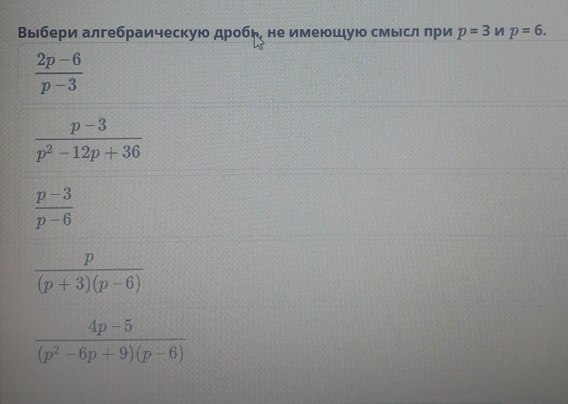 Выбери алгебраическую дробь, не имеющую смысл при р= 3 и р=6