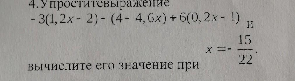 -3(1,2х - 2) - (4 - 4,6х) + 6(0,2х - 1) при х = -15/22