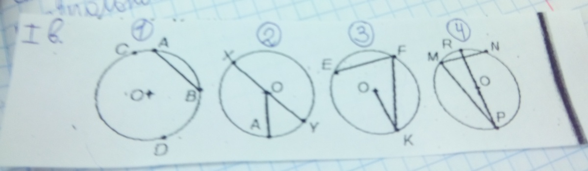 ПОМОГИТЕ ПОЖАЛУЙСТА!!! Нужно найти на этих четырёх рисунках:хорды,дуги,радиусы и диаметры.