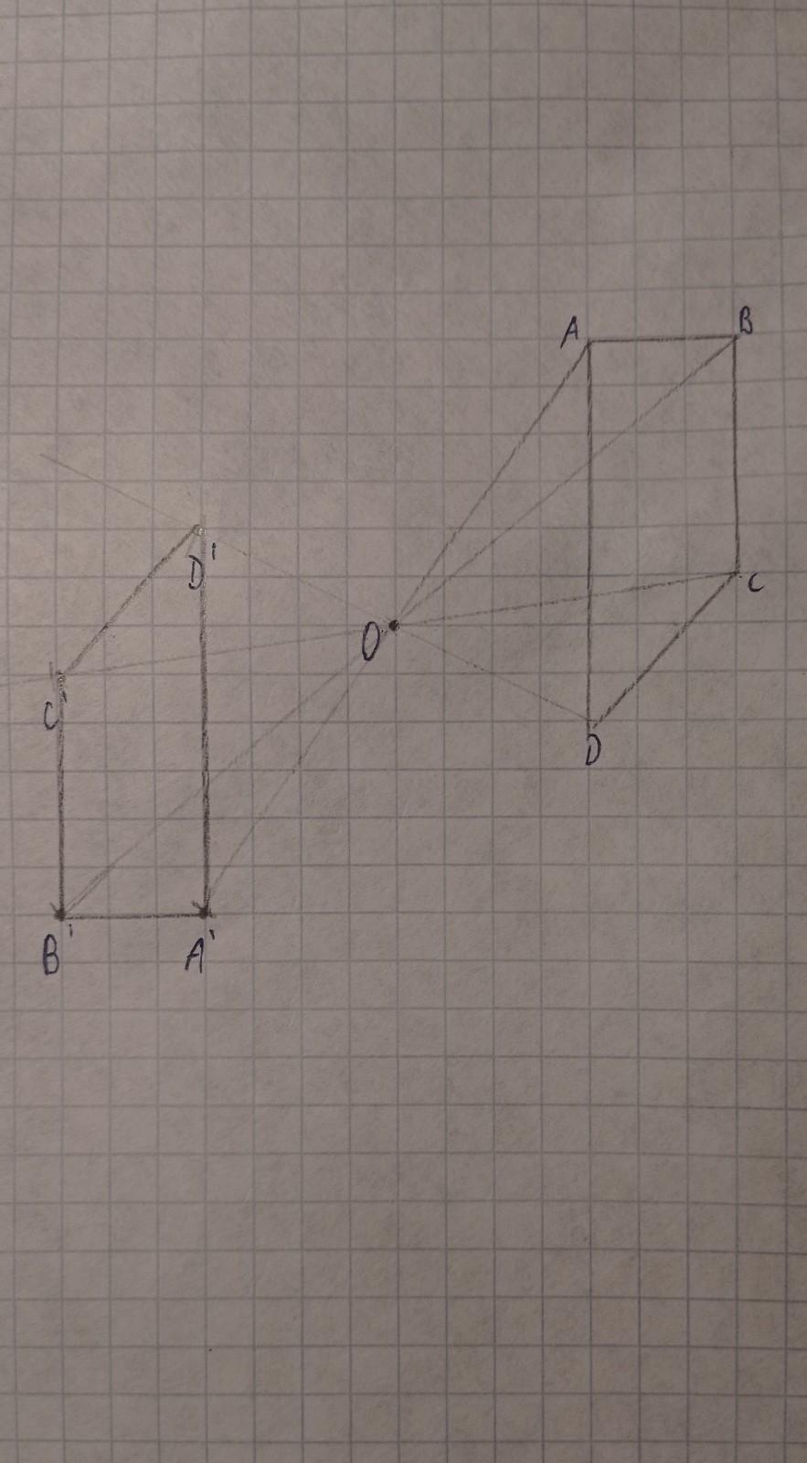 проводим линию из точки А через точку О, отмеряем такой же отрезок по длине, это и есть новая точка А'. Так проводим каждую точку и соединяем, получаем фигуру