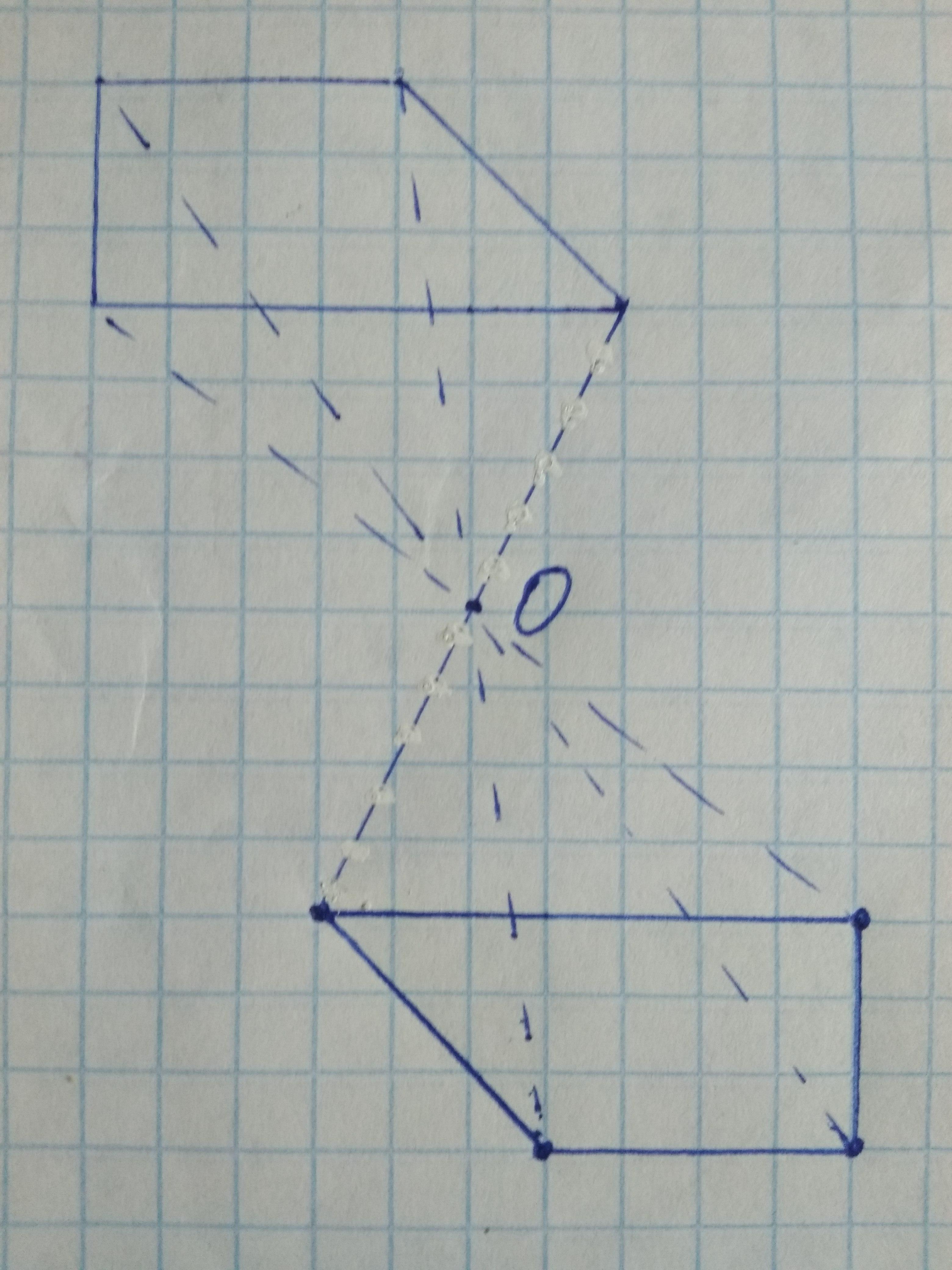 Проводи через точку О пунктирные линии и откладывай такое же расстояние после точки О, как и до неё. Это будут точки новой фигуры.