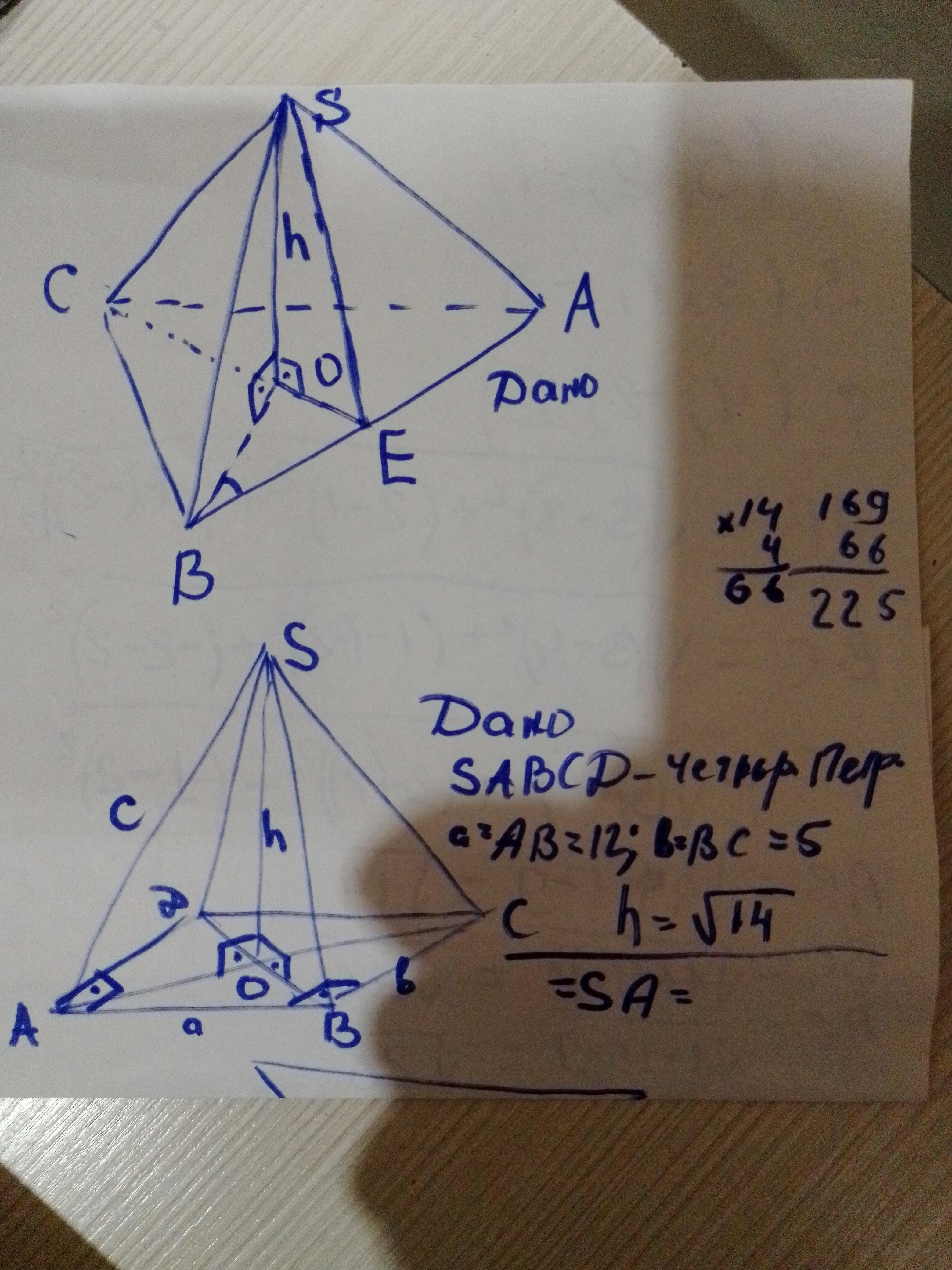 По т Пифагора из ∆АВС определяем диагонали АС, затем из ∆ SOB по теореме Пифагора определяем ребро пирамиды.