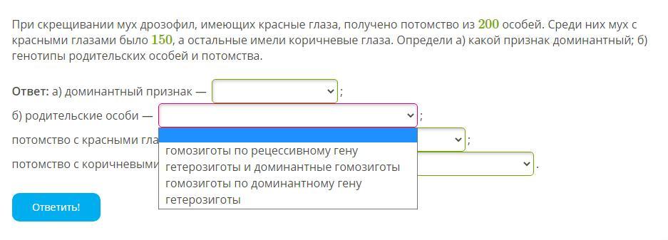 При скрещивании мух дрозофил, имеющих красные глаза, получено потомство из 200 особей. Среди них мух с красными глазами было 150, а остальные имели коричневые глаза. Определи а) какой признак доминантный; б) генотипы родительских особей и потомства.