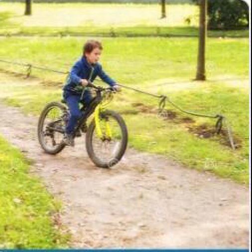 I can see oh the picture a boy. He ride on bike. Boy is smiling.