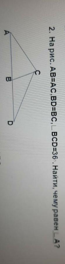 Треугольники АСВ и СВД -- равнобедренные, значит углы при основании равны. Значит угол СВД равен 180 - 36 - 36 = 108 градусов, а смежный с ниим АВС -- 72 градуса. Значит угол АСВ тоже 72 градуса. Угол А равен 180 - 72 - 72 = 36 градусам.