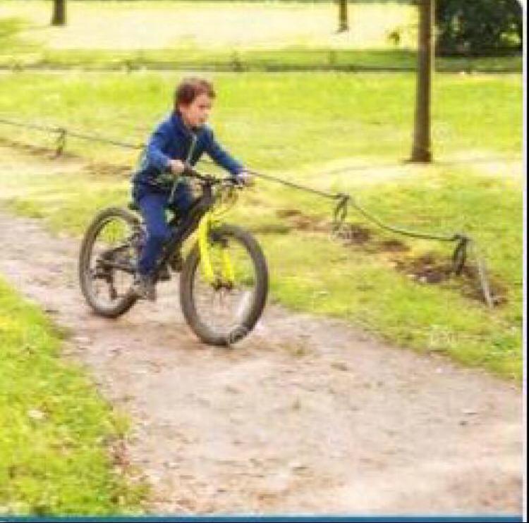 the picture shows that the weather is a little rainy and a little bit cold. The little boy decided to ride a bike in this weather. He skated with a smile, you can see from his face what he likes. Maybe it's a hobby, or something that he always does. He rides on puddles, by the way, looking at the photo, a man wants to ride a bike himself, in general, I also love bikes, they really need a person to go in for sports, but I don't think that's right ride in rainy weather, and quickly, because you can get sick, get sick and get sick, I do not prefer to ride in bad weather, but doing sports is useful