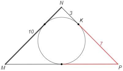 В рівнобедрений трикутник MNP з основою MP вписане коло, причому K – точка дотику, яка розділяє бічну сторону на відрізки довжиною 3 см і 7 см. Знайти периметр трикутника MNP. *