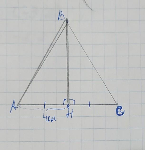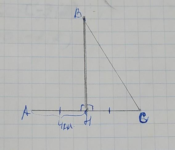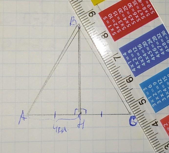 высота ВН в равнобедренном треугольнике является ещё биссектрисой и высотой, поэтому АН=НС=4клетки. (можно выбрать любое количество клеток, главное чтобы АН=НС). Соединяем точки А с В и В с С - получаем равнобедренный треугольник ∆АВС