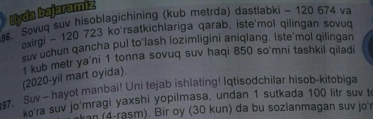 1) 120723 - 120684 = 39 m³ iste'mol qilingan.