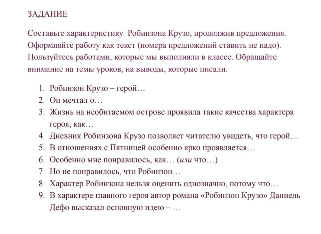 Робинзон Крузо - герой романа "Робинзон Крузо". Он мечтал поскорее выбраться с острова и поехать к возлюбленной. Жизнь на необитаемом острове проявила такие качества характера героя, как сила воли, выносливость, логика, креативность. Дневник Робинзона Крузо позволяет читателю увидеть, что герой старался делать всё для выживания. В отношениях с пятницей особенно ярко проявляется волнение за жизнь, заботливость и строгость. Особенно мне понравилось как Робинзон находил выход из почти безвыходных ситуаций. Но не понравилось, что Робинзон мало уделял время самому себе. Характер Робинзона нельзя оценить однозначно, потому что Пятницу он ограничивал в действиях, а себя почти нет. В характере главного героя автор романа "Робинзон Круза" Даниель Дефо высказал основную идею - безделье не к чему не приведёт.