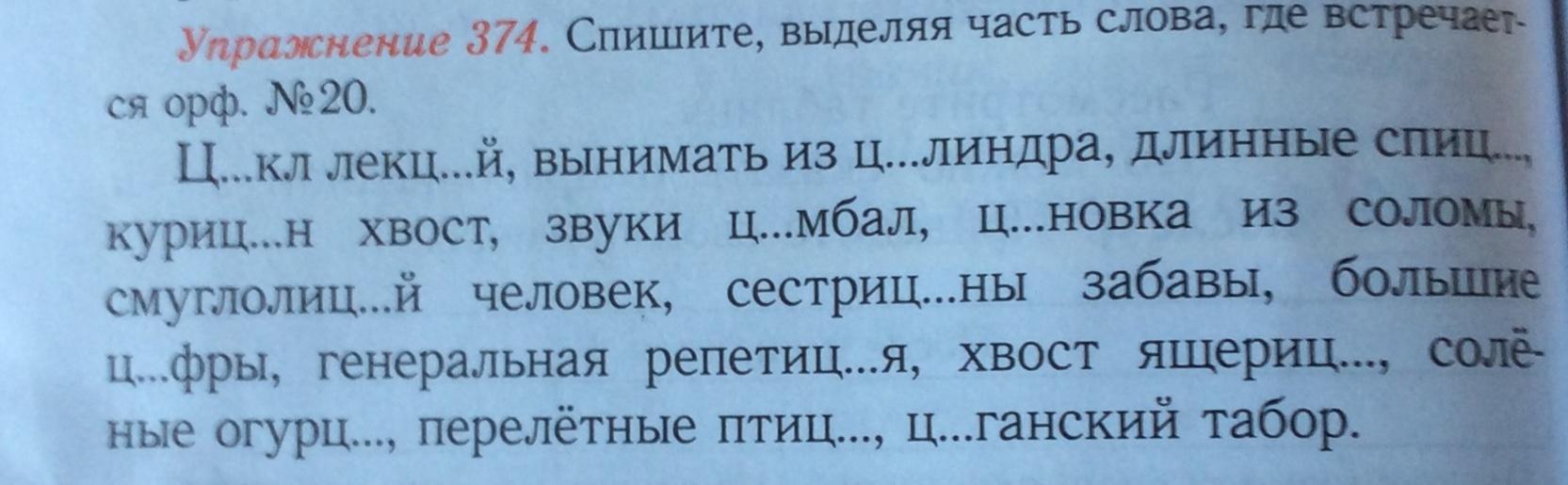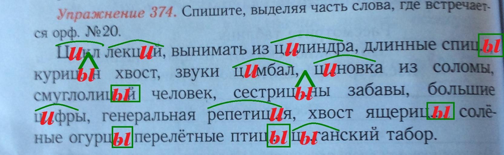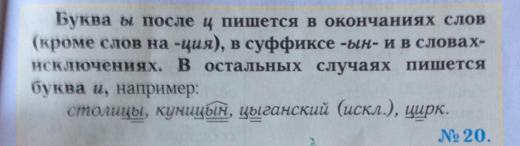 В корнях слов после Ц следует писать букву И (например: ЦИРК, ЦИТАТА) во всех словах, кроме слов-исключений: ЦЫГАН, ЦЫПОЧКИ, ЦЫПЛЕНОК, ЦЫКНУТЬ, ЦЫЦ. ... В окончаниях и суффиксах после Ц пишется Ы (например: БОЙЦ-Ы, ОГУРЦ-Ы, СЕСТРИЦ-ЫН, ЦАРИЦ-ЫН-О).
