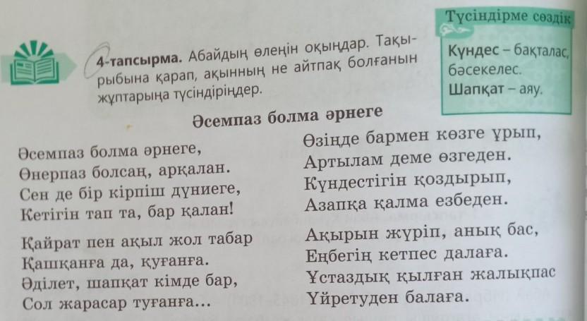 4 - тапсырма . Абайдың өлеңін оқыңдар . Тақы рыбына қарап , ақынның не айтпақ болғанын жұптарыңа түсіндіріңдер .СРОЧНО ПОММГИТЕ ПОЖАЛУЙСТА ОЧЕНЬ НУЖНО ПОЖАААААЛУЙСТААА