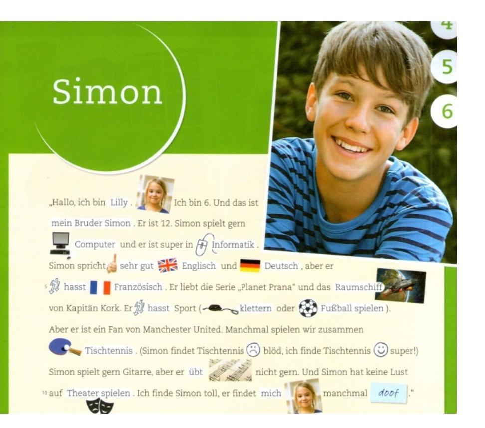 Саймон «Привет, я Лилли, мне 6. А это мой брат Саймон. Ему 12. Саймон играет на компьютере и отлично разбирается в É informatik. Саймон очень хорошо говорит по-английски и по-немецки, но ненавидит французский 3. Ему нравится сериал «Планета Прана» и космический корабль капитана Корка. Он ненавидит спорт (-. Лазать или играть в футбол). Но он фанат «Манчестер Юнайтед». Иногда мы вместе играем в настольный теннис. мне кажется, что настольный теннис - это здорово!) Саймон любит играть на гитаре, но он не любит практиковаться, и Саймону не нравится играть в театре. Я думаю, что Саймон великолепен, иногда он думает, что я глупый