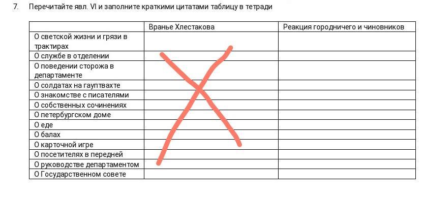 Нужно заполнить в таблице третью колонку " Реакция городничего и чиновников на вранье Хлестакова " краткими цитатами из текста. ( Колонку с крестом заполнять не нужно )