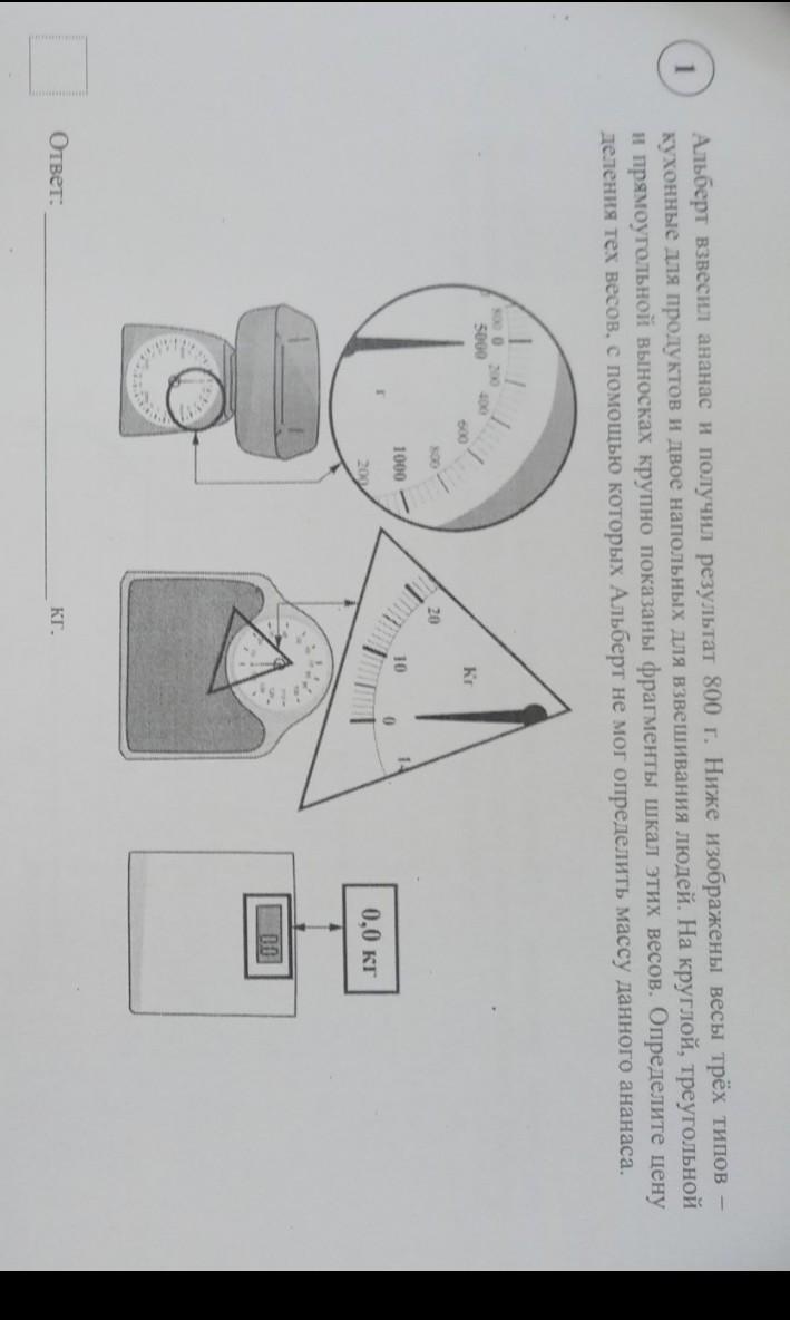 Альберт взвесил ананас и получил результат 800г. Ниже изображены весы трёх типов-кухонные для продуктов и двое напольных для взвешивания людей. На круглой,треугольной и проямоугольной выносках крупно показаны фрагменты шкал этих весов. Определите цену деления тех весов,с помощью которых Альберт не мог определить массу данного ананаса