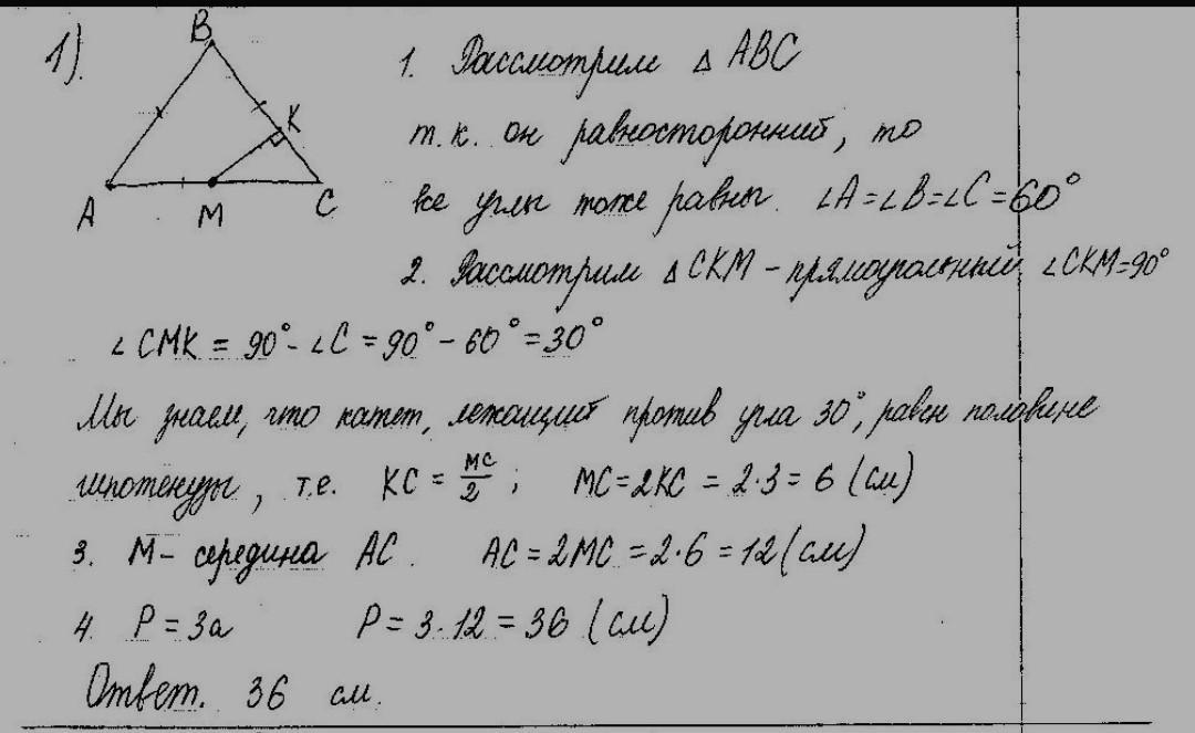В равностороннем треугольнике ABC из середины M стороны AC опущен перпендикуляр MK на сторону BC. Найдите периметр треугольника ABC если KC=3см