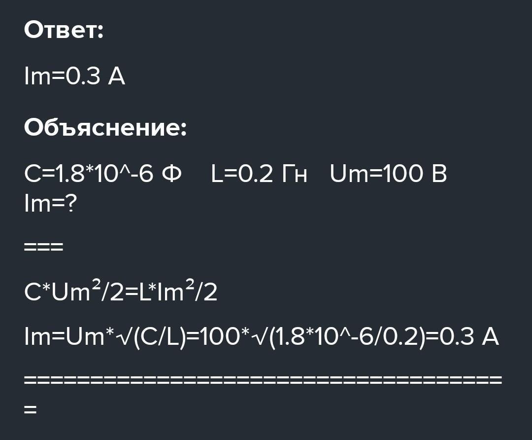 Колебательный контур состоит из конденсатора электроемкостью С =1,8 мкФ и катушки индуктивности L=0,2 Гн. Определите максимальную силу тока в контуре, если максимальная разность потенциалов на обкладках конденсатора 100 В