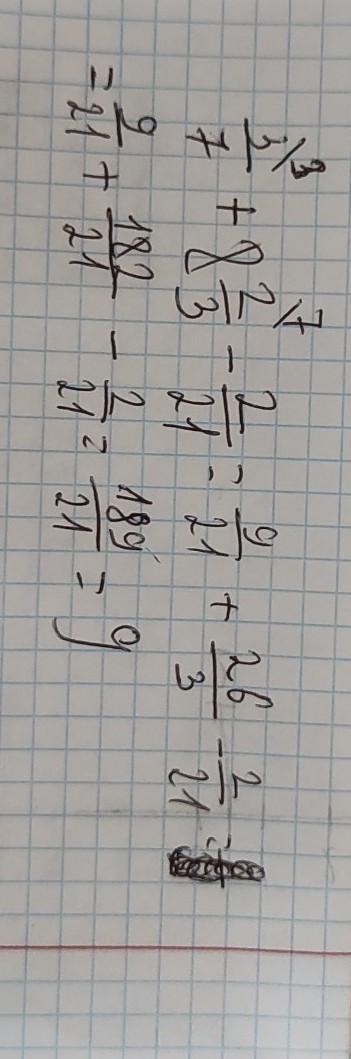 Помогите пожалуйста Найдите значение выражения дробь, числитель — 3, знаменатель — 7 плюс 8 дробь, числитель — 2, знаменатель — 3 минус дробь, числитель — 2, знаменатель — 21 .
