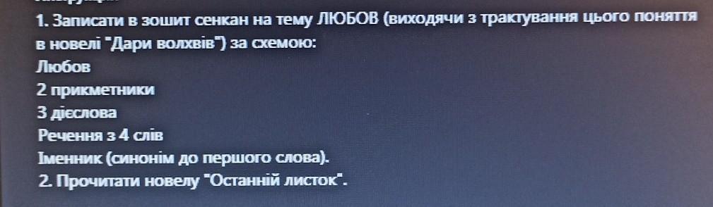 1. Записати в зошит сенкан на тему ЛЮБОВ (виходячи з трактування цього поняття