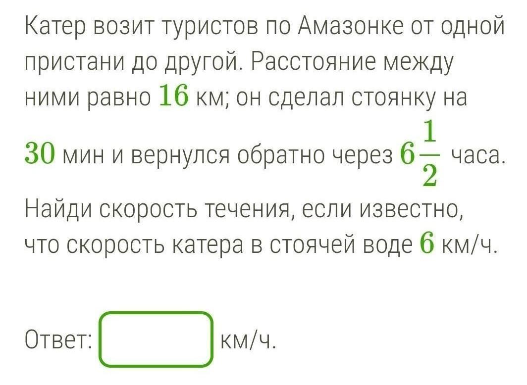 Катер возит туристов по Амазонке от одной пристани до другой. Расстояние между ними равно 16 км; он сделал стоянку на 30 мин и вернулся обратно через 6 1/2 часа. Найди скорость течения, если известно, что скорость катера в стоячей воде 6 км/ч.