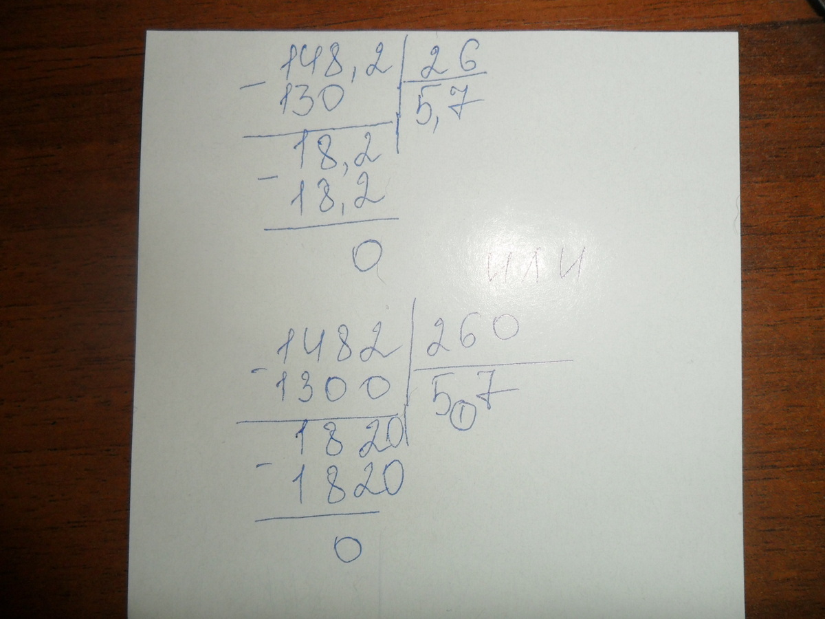 Теперь письменно:)1482 делим на 260...Берём по 5. 5*0=0,5*6=30(0 пишем 3 в уме) и 5*2=10 и плюс 3 в уме получается 13. значит 260*5=1300,вычитаем 1482-1300 = 182.т.к 182 неделится на 260 сносим ноль. ставим запятую...решаем дальше берём по 7 получается 260*7 = 1820. вычитаем 1820-1820=0. Всё Ответ:5,7. Можешь проверить на калькуляторе всё верно)