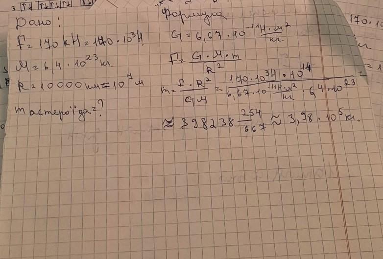 Визначити масу астероїда , якщо сила притягання між ним і марсом становить 170кН . Відстань до Марса 10000км . Маса Марса 6,4*10^23кг