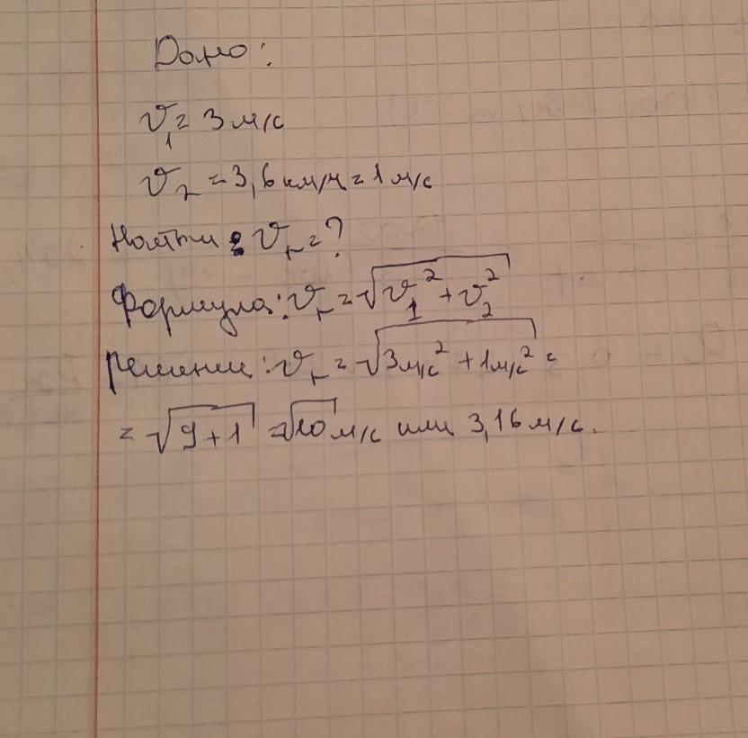 Турист бежит вдоль берега реки со скоростью 3м/с относително земли, пытаясь догнать отвязавшийся на стоянке плот. Скорость течения реки 3,6км/ч. Определите скорость туриста относительно плота