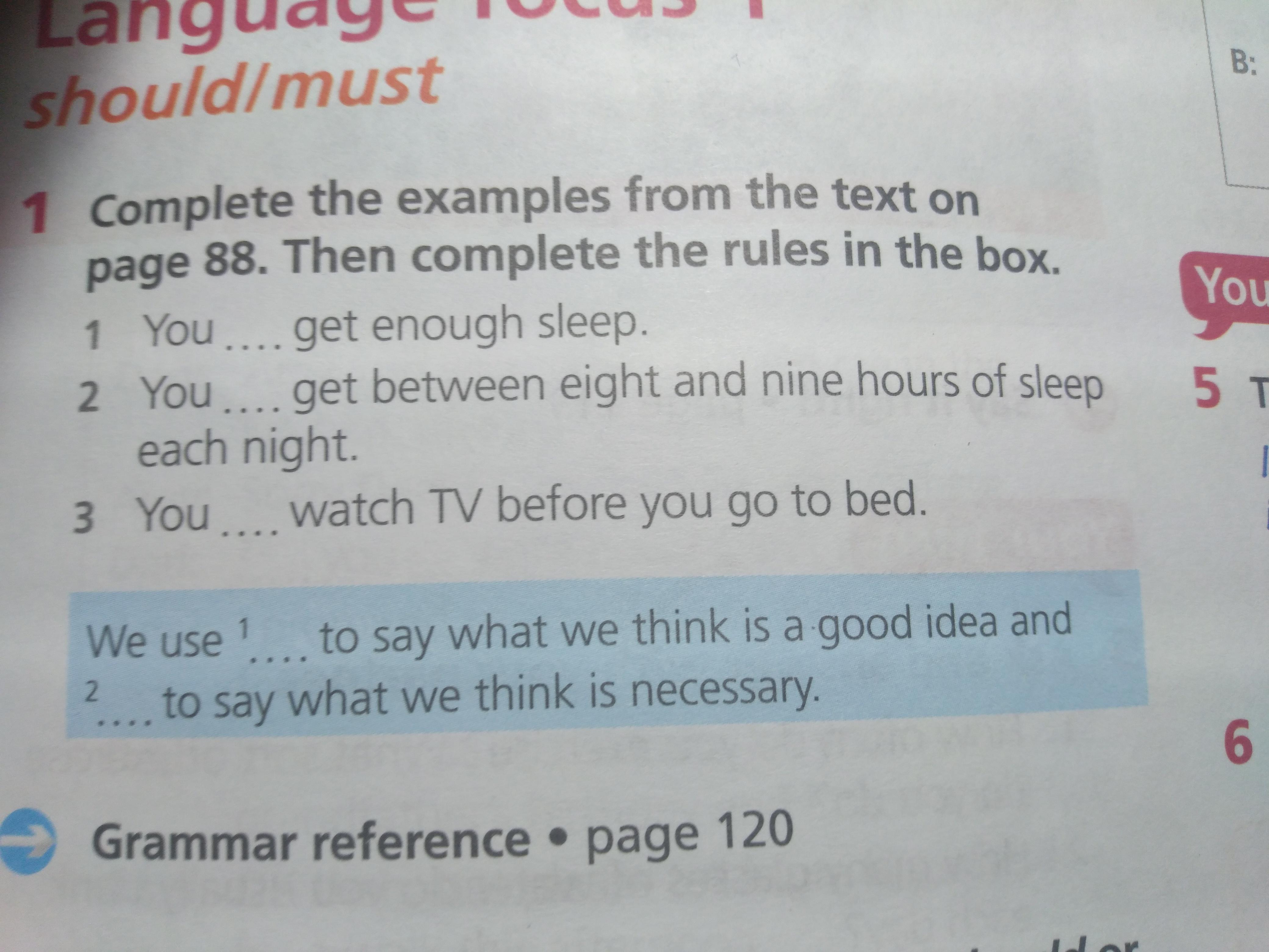 Complete the examples from the text on page 88. Then complete the rules in the box. 1 You … get enough sleep. 2 You … get between eight and nine hours of sleep each night. 3. You...watch TV before you to bed.