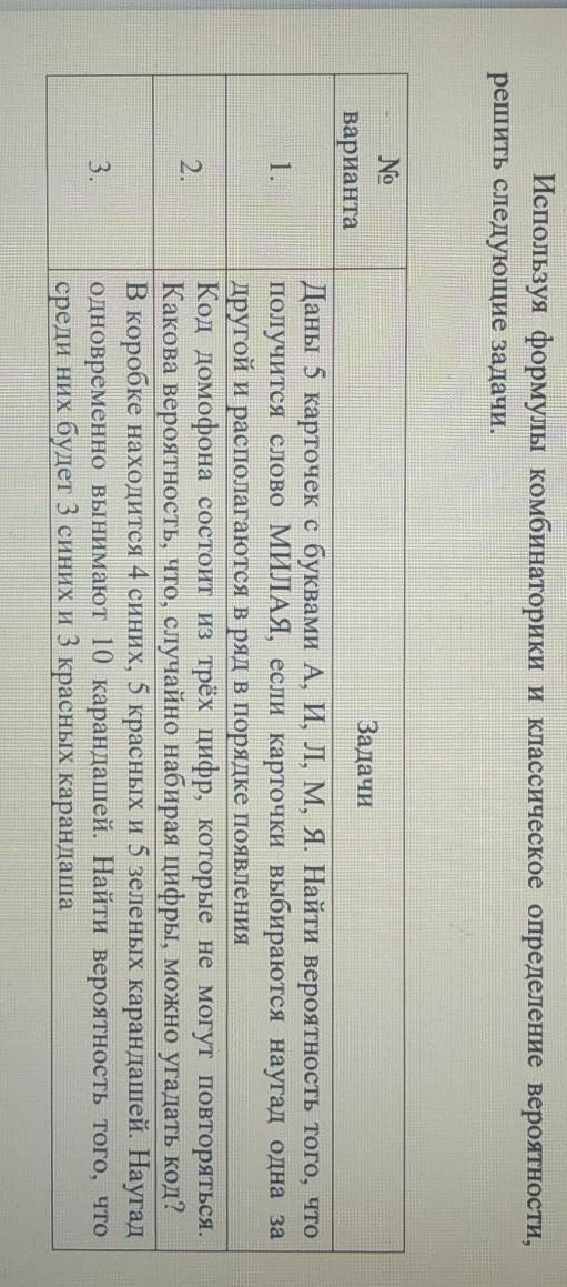 3. Тут не до конца ясно условие, есть 2 варианта: ровно 3 синих и 3 красных,или хотя бы 3 синих и 3 красных. Рассмотрю первый вариант он проще. Получается, что в коробке осталось 1 синий, 2 красных и 1 зеленый. Рассчитаем вероятность невыбора этих карандашей. Вероятность оставить синий 4/14, красный 5/15, зеленый 5/14. Нам не важен порядок "невыбора" карандашей, значит нужно узнать количество комбинаций из 4 карандашей 4*3*2*1=24. Итого: полная вероятность 4/14*5/15*5/15*5/14*24= 750/2401
