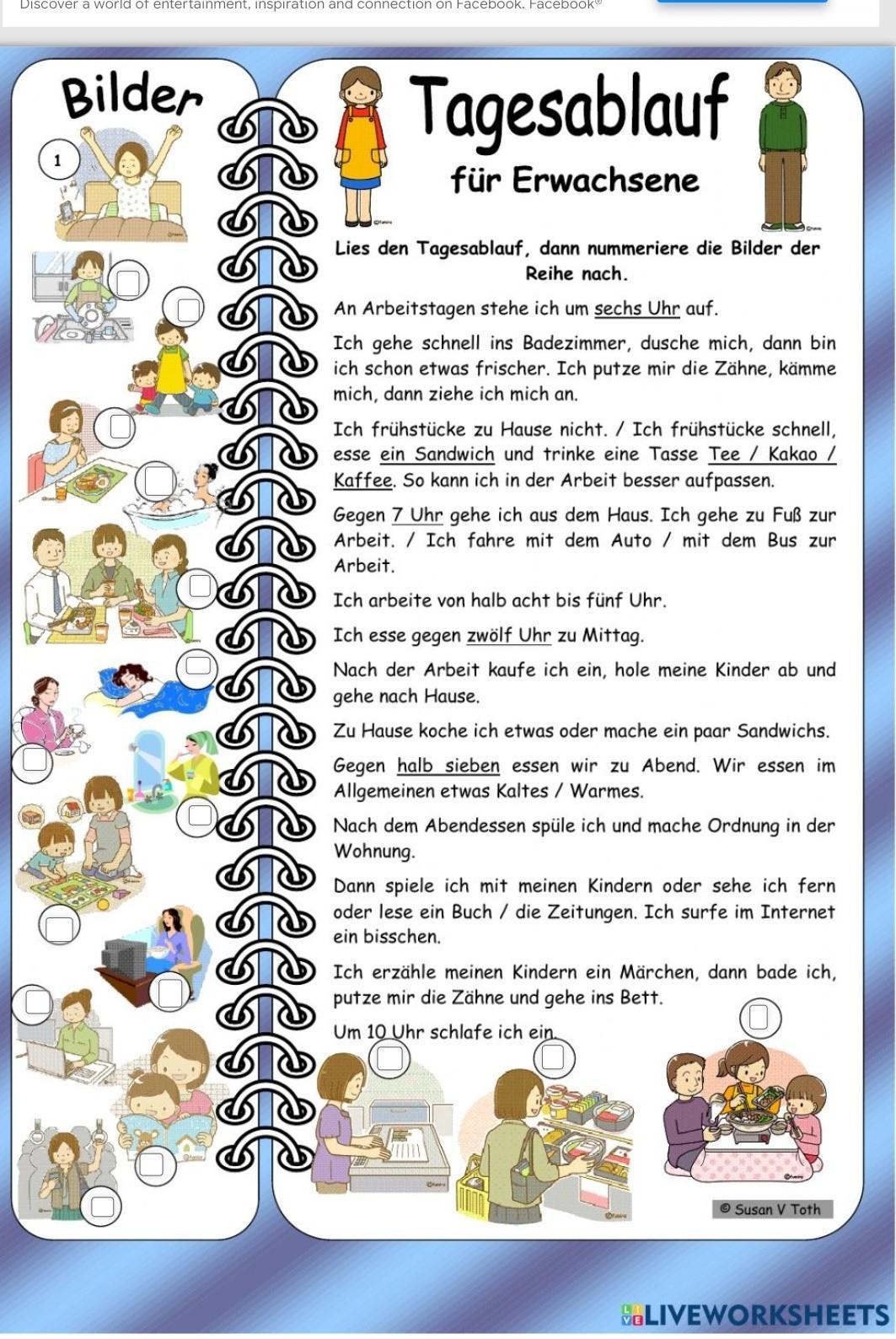 Распорядок дня для взрослых Прочтите распорядок дня, а затем используйте картинки по порядку. В будни встаю в 6 утра. Я быстро иду в ванную, принимаю душ, и тогда я буду немного свежее. Я чищу зубы, расчесываю волосы, затем одеваюсь. Я не завтракаю дома. / Я быстро завтракаю, ем бутерброд и выпиваю чашку чая / какао / кофе, поэтому я могу быть более осторожным на работе. Около 7 утра выхожу из дома. Я иду на работу. / Еду на работу на машине / на автобусе. Работаю с половины восьмого до пяти. Я обедаю около двенадцати часов. После работы я хожу по магазинам, забираю детей и иду домой. Дома я что-то готовлю или делаю бутерброды. Ужинаем около половины седьмого. V Мы обычно едим что-нибудь холодное / теплое. После обеда перематываю и убираю квартиру. Затем я играю с детьми, смотрю телевизор или читаю книгу / газеты. Я немного сижу в Интернете. Рассказываю детям сказку, потом купаюсь, чищу зубы и ложусь спать. Я засыпаю в 7 часов вечера