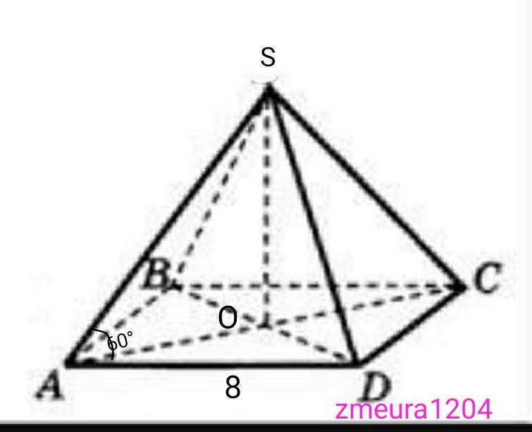 Найдите объем и площадь полной поверхности правильной четырехугольной пирамиды, боковое ребро которой создает с площадью основания угол 60 градусов, а сторона основания равняется 8см