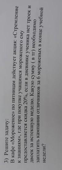 20% от стоимости мороженого будет 1/5 от стоимости мороженого -это будет скидка на одно мороженое,5/5-1/5=4/5 от стоимости будет стоить одно мороженое, Для шести учеников есть смысл узнавать?