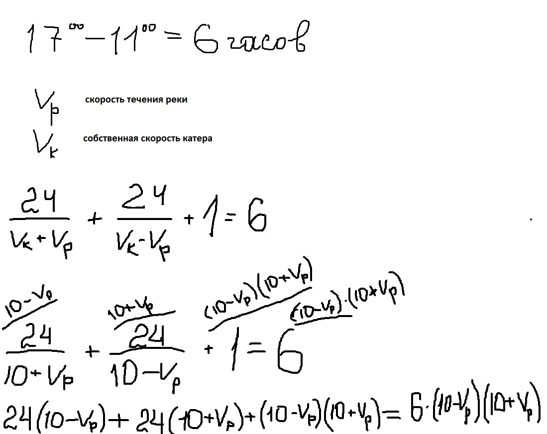 Катер вышел из пункта A в 11.00, и, пройдя вних по течению реки 24 км, прибыл в пункт D. Сделав остановку на 1 час, катер вернулся обратно в пункт A в 17.00 того же дня. Определите скорость реки, если собственная скорость равна 10 км/час.