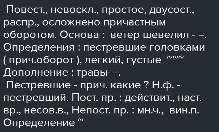 Легкий ветер шевелил густые травы пестревшие разноцветными головками- синтаксический разбор
