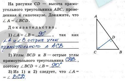 на рисунке отрезок CD высота прямоугольного треугольника ABC проведенная к гипотенузе Докажи что угол А равен углу BCD