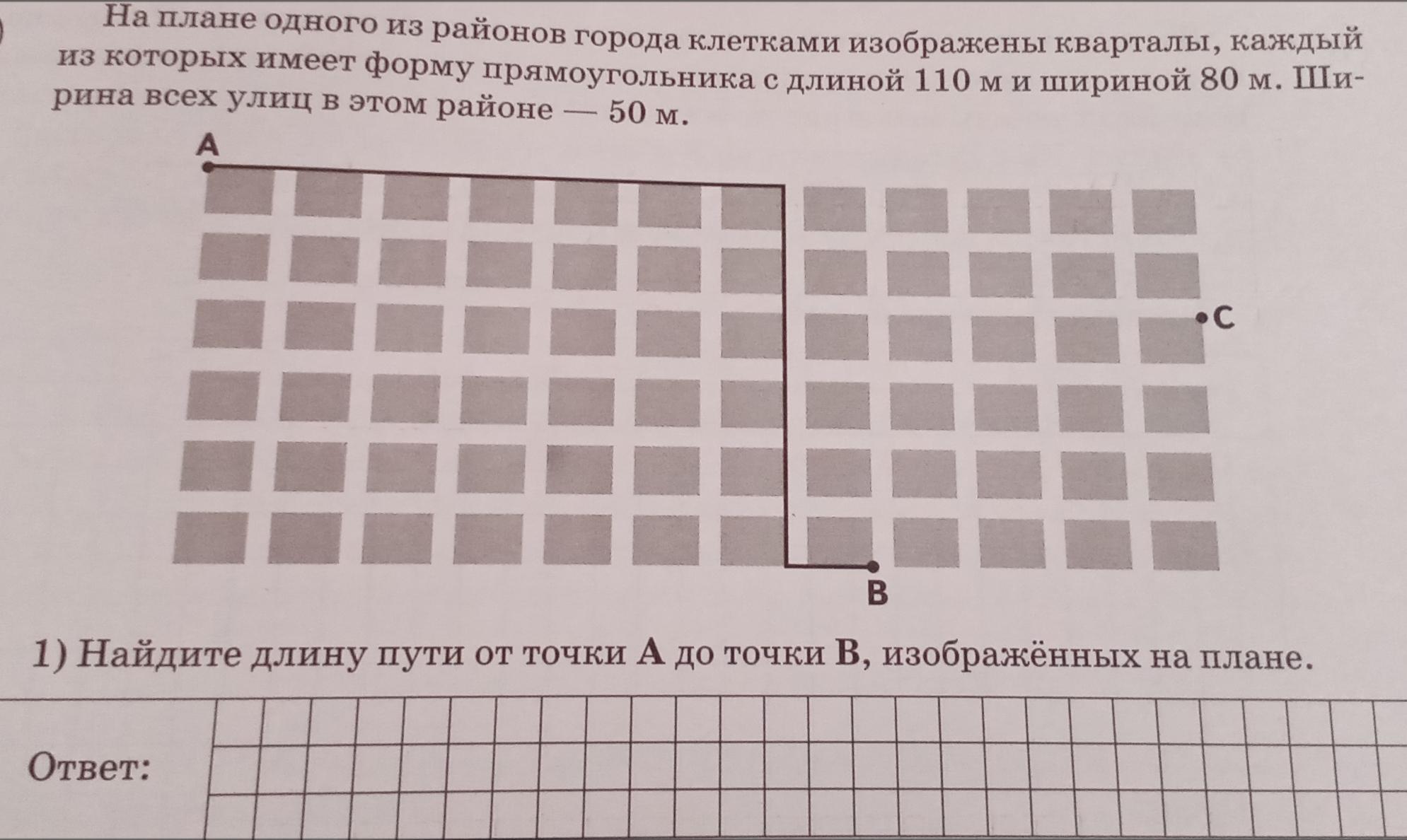 из которых имеет форму прямоугольника с длиной 110 м и шириной 80 м. Ширина всех улиц в этом районе - 50 м.