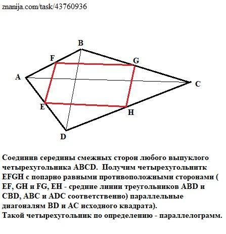 Соединив середины смежных сторон любого выпуклого четырехугольника ABCD. Получим четырехугольник EFGH с попарно равными противоположными сторонами ( EF, GH и FG, EH - средние линии треугольников ABD и CBD, АВС и ADC соответственно) параллельные диагоналям BD и АС исходного квадрата).