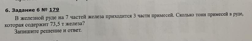 Выясним, сколько будет весить руда, содержащая 73,5 т железа: 73,5: дробь, числитель — 7, знаменатель — 10 =105 т.
