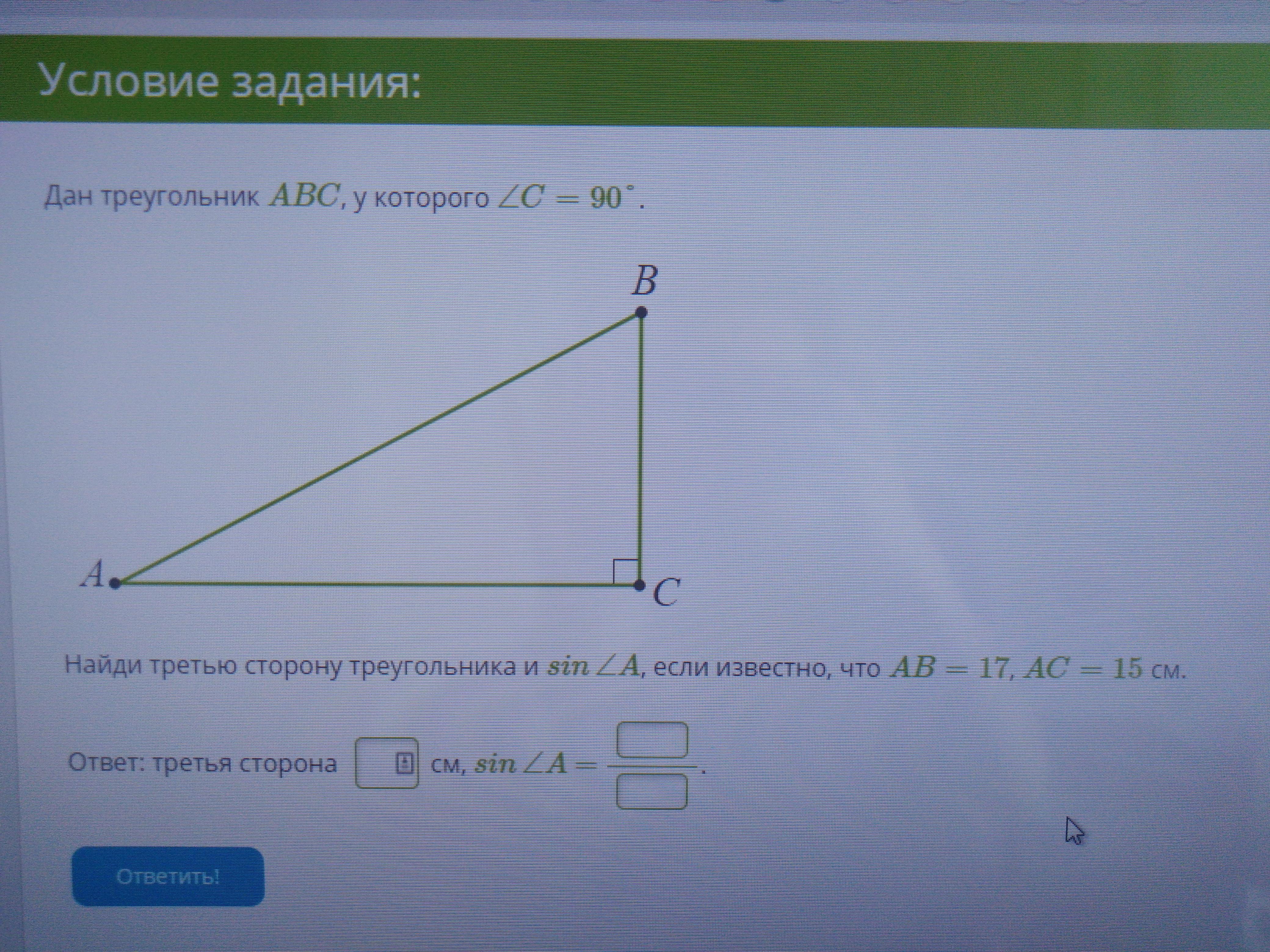 Найди третью сторону треугольника и sin угла А, если известно, что АВ=17,АС=15
