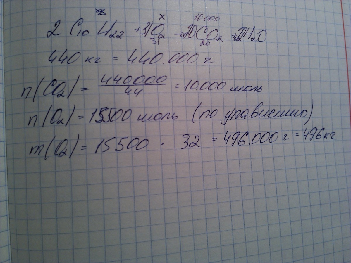 Найти массу кислорода необходимого для сжигания декана C10H22 если при этом образовалось 440 кг углекислого газа