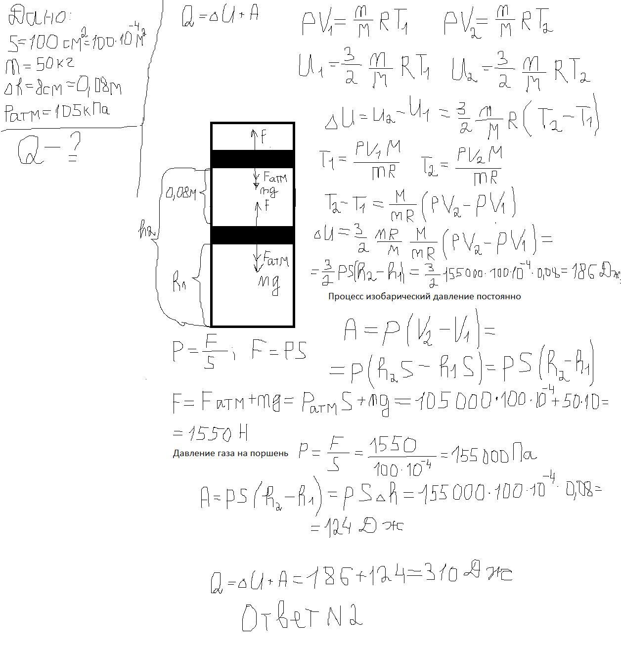В вертикальном открытом цилиндре c площадью основания 100 см2 на некоторой высоте находится поршень массой 50 кг, под которым имеется идеальный одноатомный газ. Какое количество теплоты необходимо сообщить газу, чтобы поршень поднялся на 8 см? Атмосферное давление 105 Па. Поршень скользит внутри цилиндра без трения.