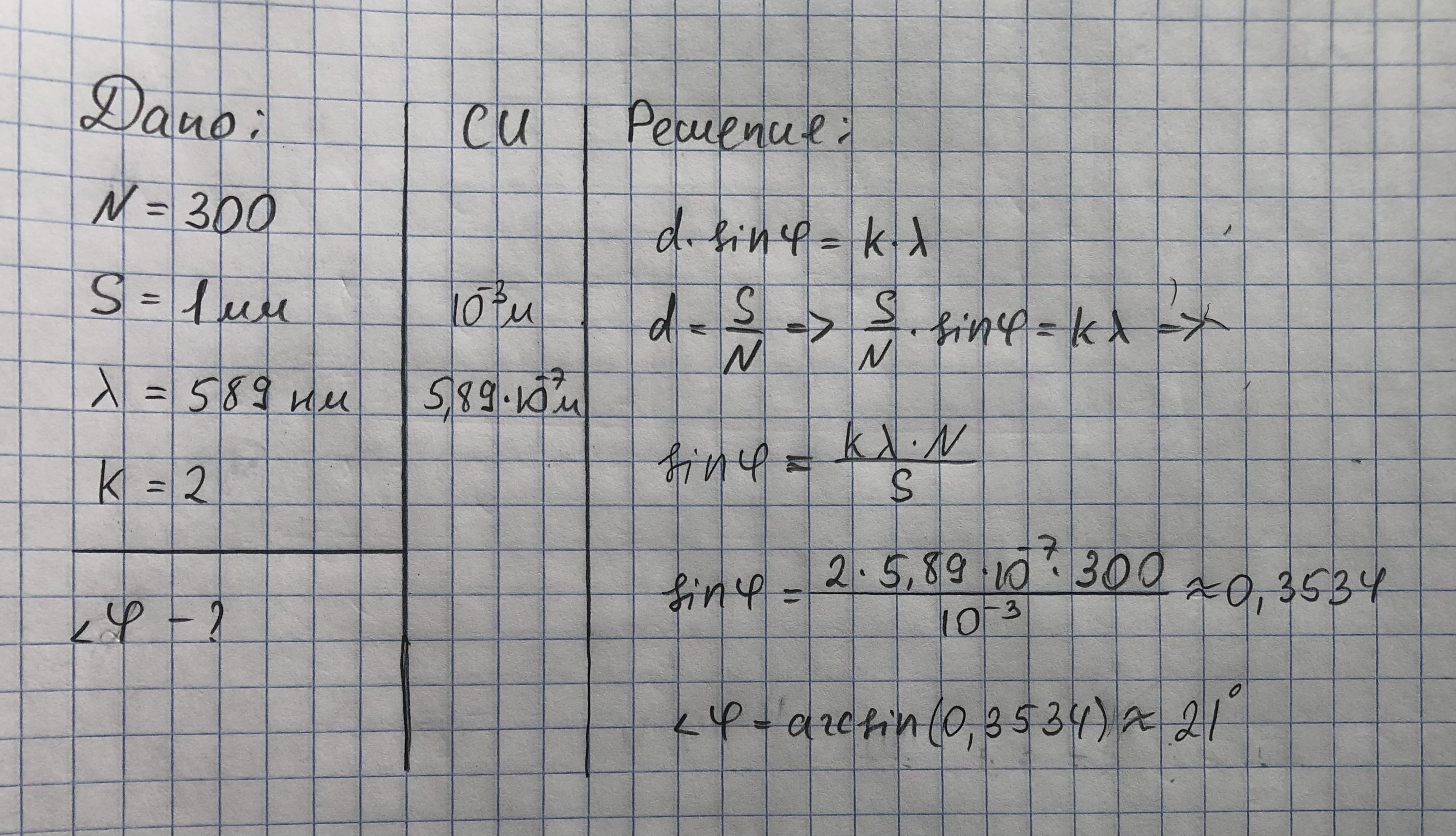 Дифракционная решетка, имеющая 300 полос на миллиметр, освещается монохроматическим светом. Длина волны света 589 нм. Под каким углом можно наблюдать спектр второго порядка?