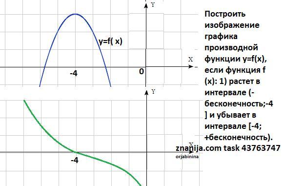 Построить изображение графика производной функции у=f(x), если функция f (x): 1) растет в интервале (- бесконечность;-4] и убывает в интервале [-4;+бесконечность).
