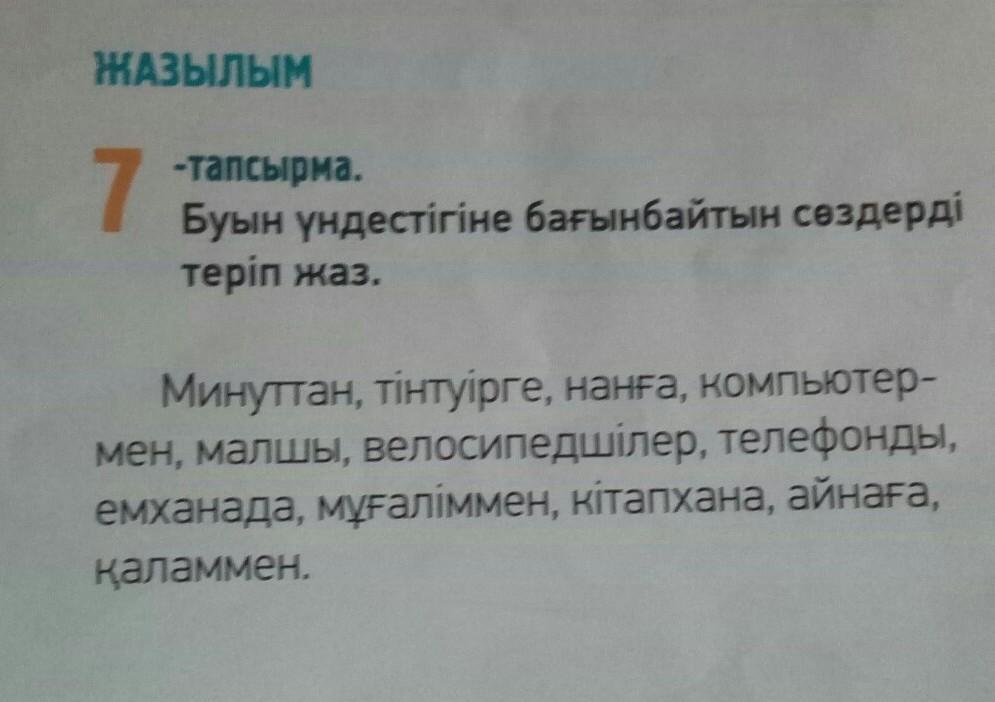Минуттан,компьютермен,велосипедшілер,телефонды,мұғаліммен,емханада,қаламмен.