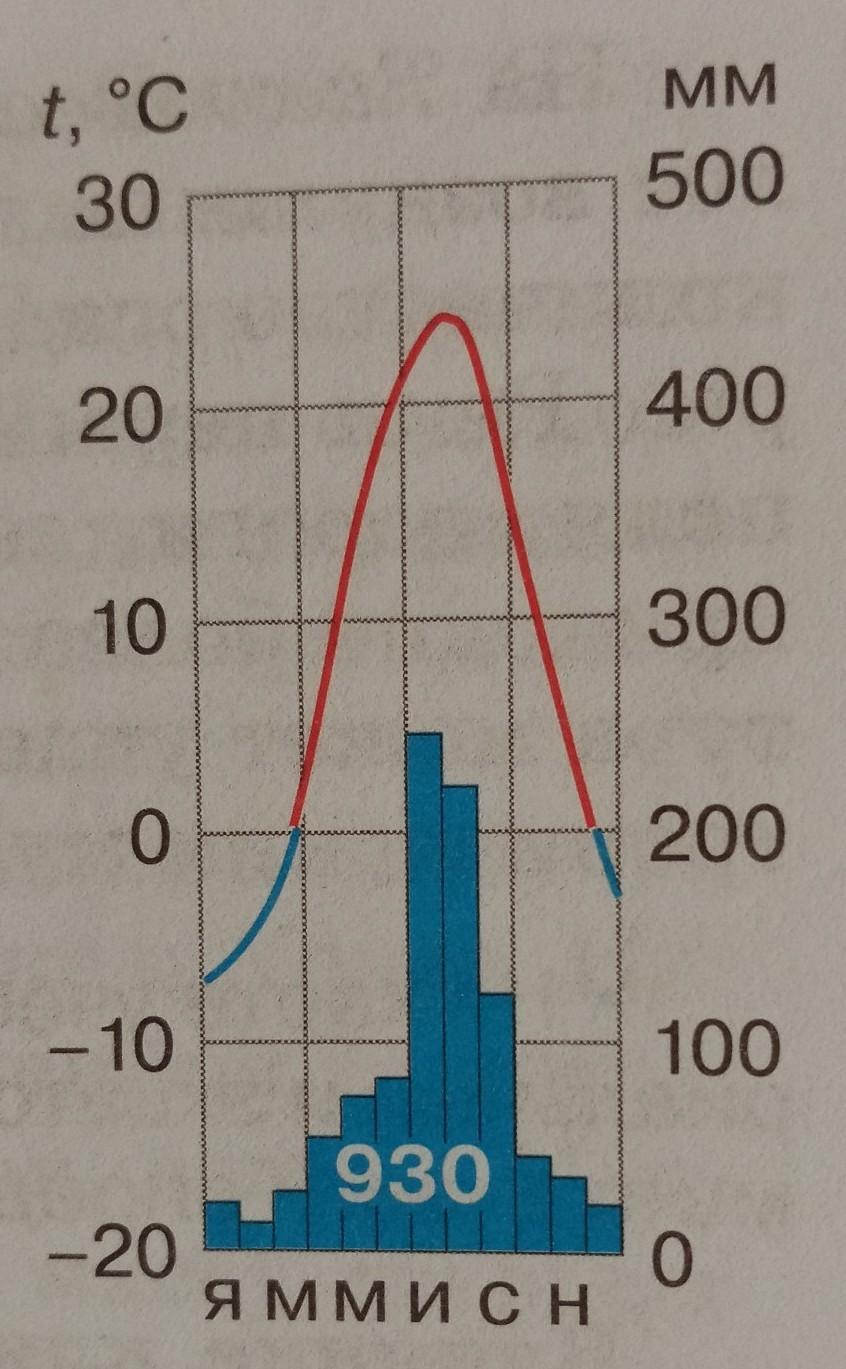 3) Количество осадков = 930 мм. Наибольшее количество осадков выпадает летом.