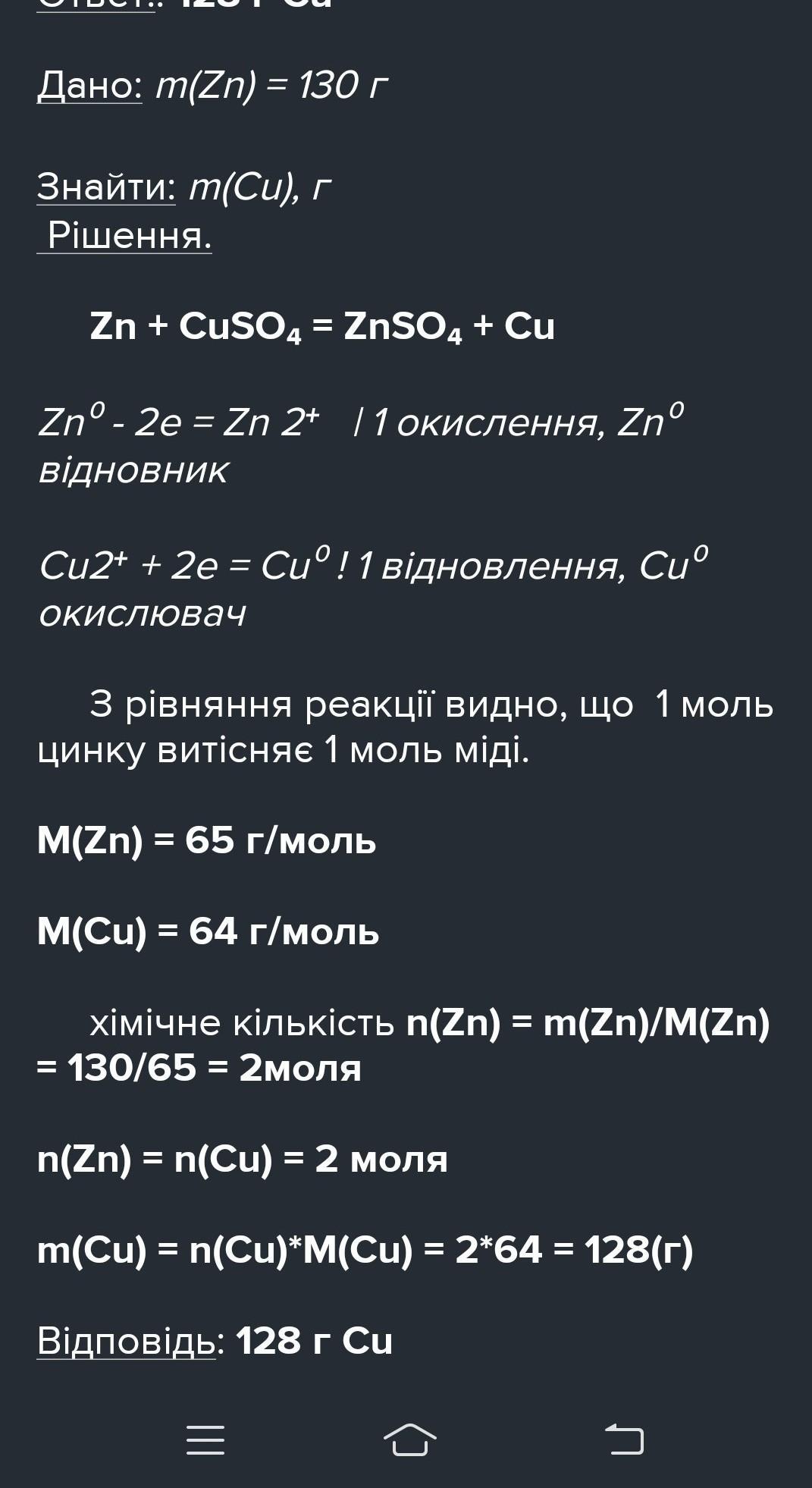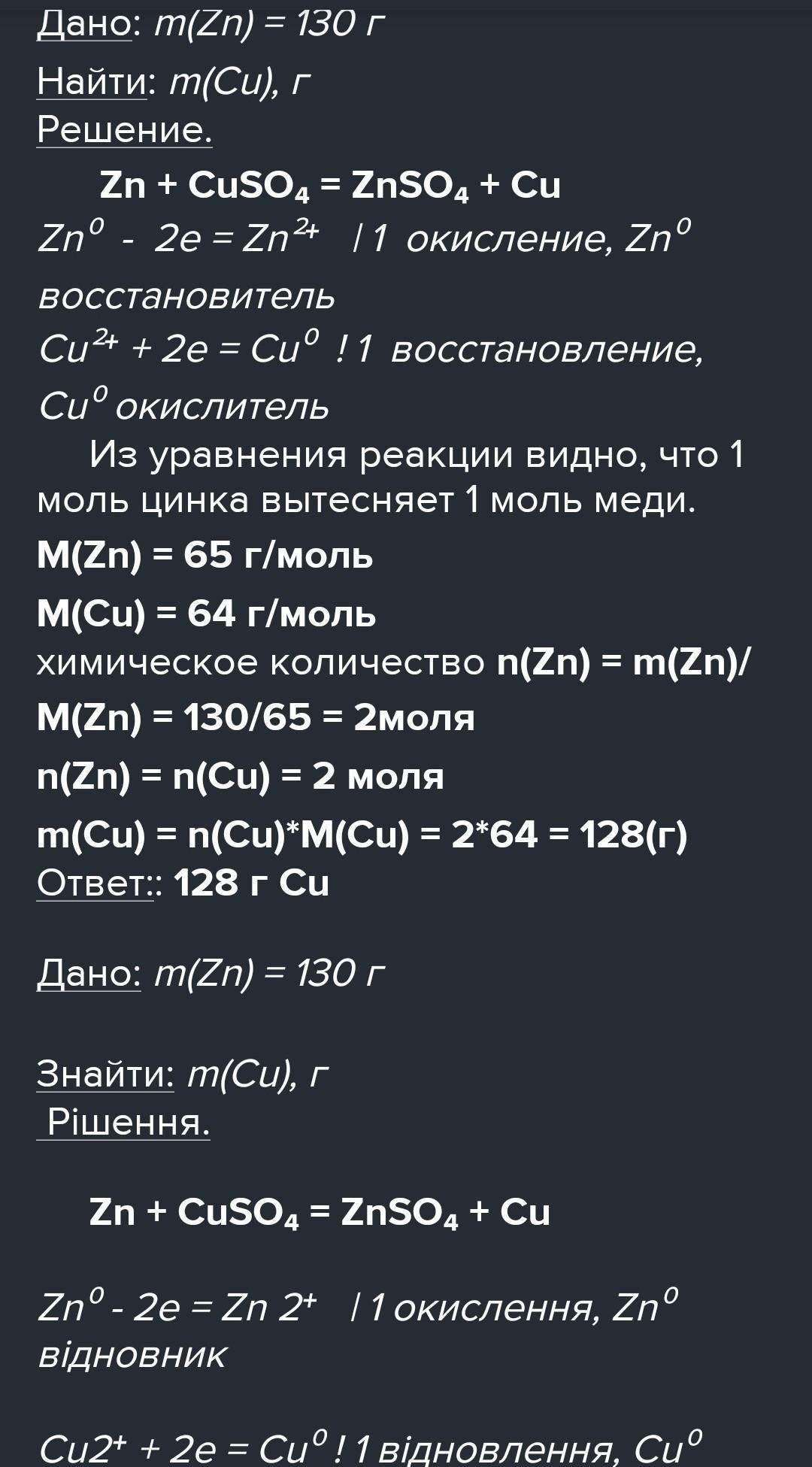Обчисліть масу (г) міді яку витіснить цинк масою 13 г з достатньою кількістю розчину купрум(ll) сульфату