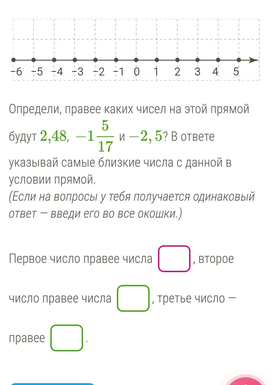 Определи, правее каких чисел на этой прямой будут 2,48, −1517 и −2,5? В ответе указывай самые близкие числа с данной в условии прямой.