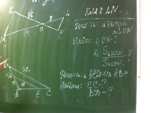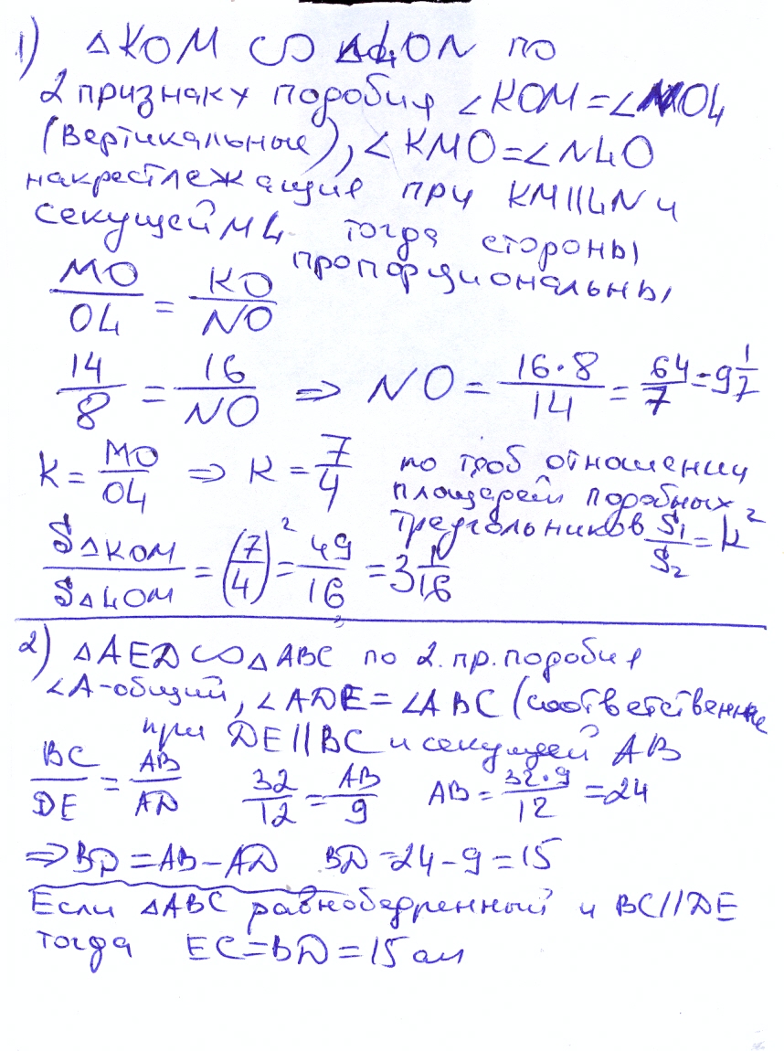 1) Треугольники подобны по первому признак подобия треугольников: Если угол одного треугольника равен углу другого, а стороны, образующие тот угол в одном треугольнике, пропорциональны соответствующим сторонам другого, то такие треугольники подобны.(угол КОМ=углу ЛОN, т.к. вертикальные)