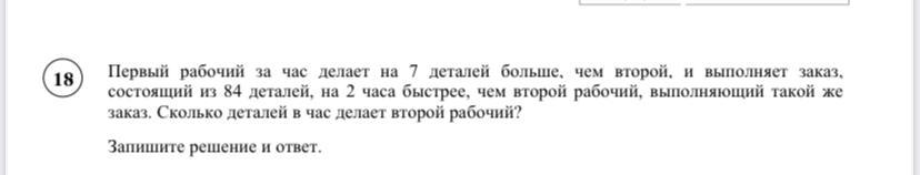 Если первый рабочий делает 21 деталь в час тэ, то он выполнит работу за 4 часа, а второй соответственно 14 и выполняет работу за 6