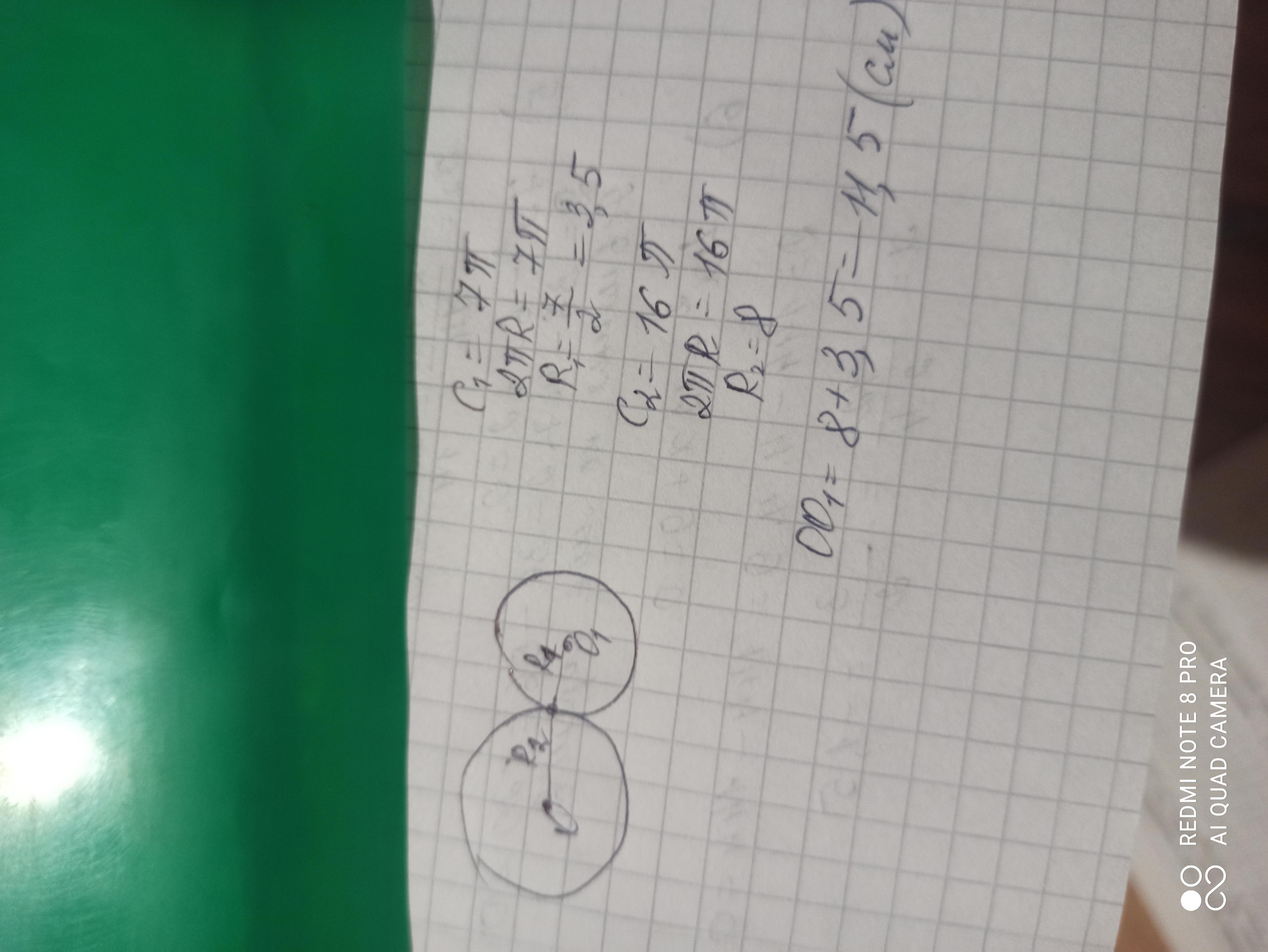 Два кола, довжини яких дорівнюють 7 л см і 16 л см, мають зовнішній дотик. Знайти відстань між центрами цих кіл (у см).